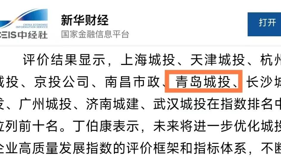 青島城投集團榮登中國城投企業(yè)高質(zhì)量發(fā)展指數(shù)排行榜第六名
